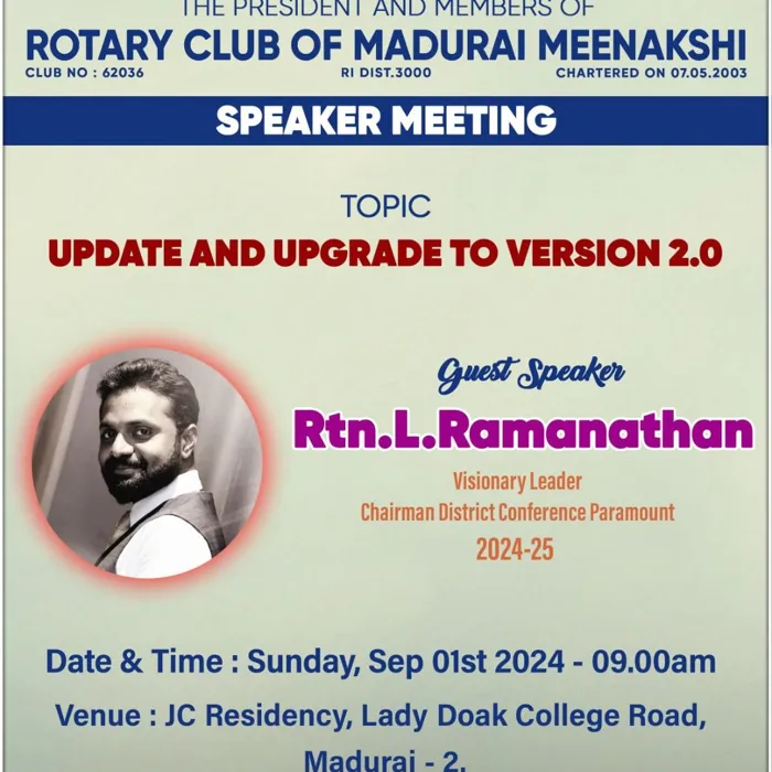 Speaker meeting on behalf of Rotary Club of Madurai Meenakshi today morning Rotarian Ramanathan great speech made the association members think many things more than one hour great speech thanks Rtn.Ramanathan brother.