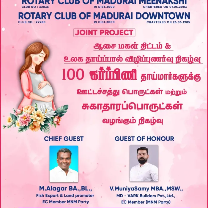 ரோட்டரி கிளப் ஆப் மதுரை மீனாட்சி மற்றும் ரோட்டரி கிளப் மதுரை Down Town இணைந்து நடத்திய joint project ஆசை மகள் மற்றும் உலக தாய்ப்பால் விழிப்புணர்வு நிகழ்வு இன்று சிறப்பாக நடைபெற்ற முடிந்தது இதில் நூற்றுக்கும் மேற்பட்ட கர்ப்பிணி பெண்களுக்கு ஐந்துக்கும் மேற்பட்ட பழங்கள் ஊட்டச்சத்து பொருட்கள் மற்றும் சத்துப் பொருட்கள் சங்கம் சார்பாக வழங்கப்பட்டது இந்நிகழ்வில் கலந்து கொண்ட மற்ற சங்க உறுப்பினர்கள் அனைவருக்கும் ரோட்டரி கிளப் ஆப் மதுரை மீனாட்சி மற்றும் ரோட்டரி கிளப் Down Town சார்பாக என்னுடைய நெஞ்சார்ந்த நன்றியை தெரிவித்துக் கொள்கிறேன்.